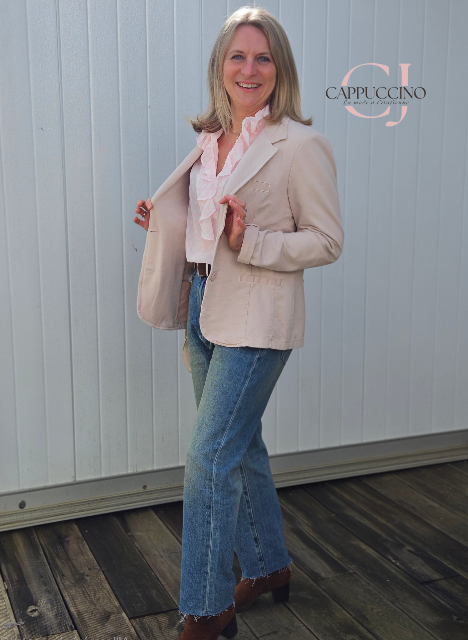 chemisier façon blouse(sans boutons), léger, manches courtes, col à frou-frou