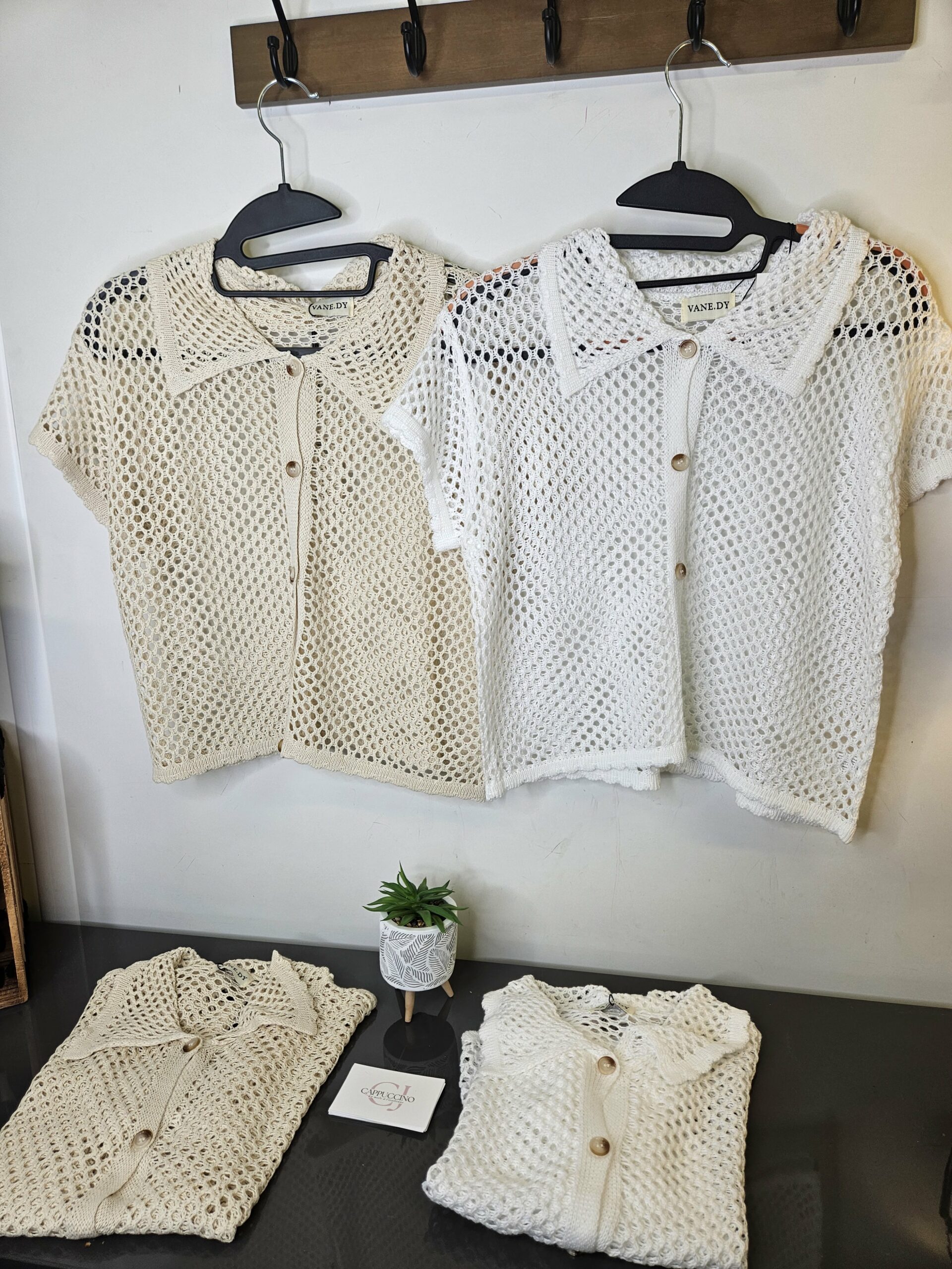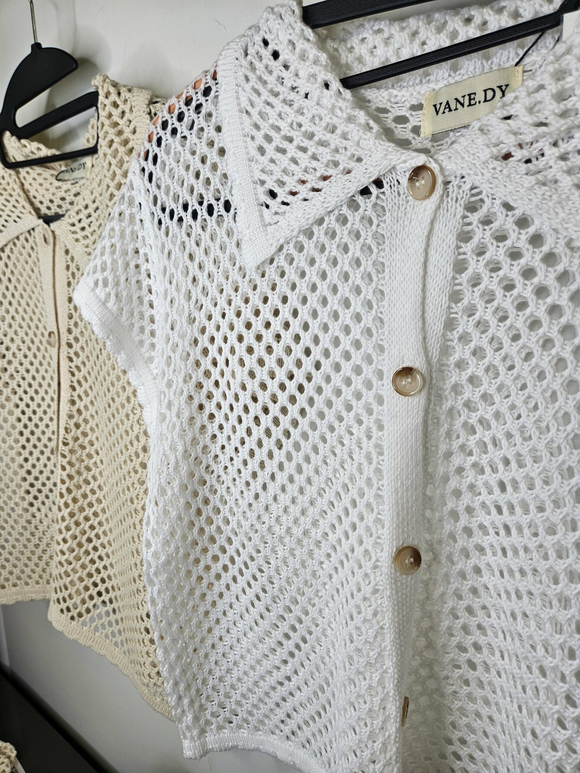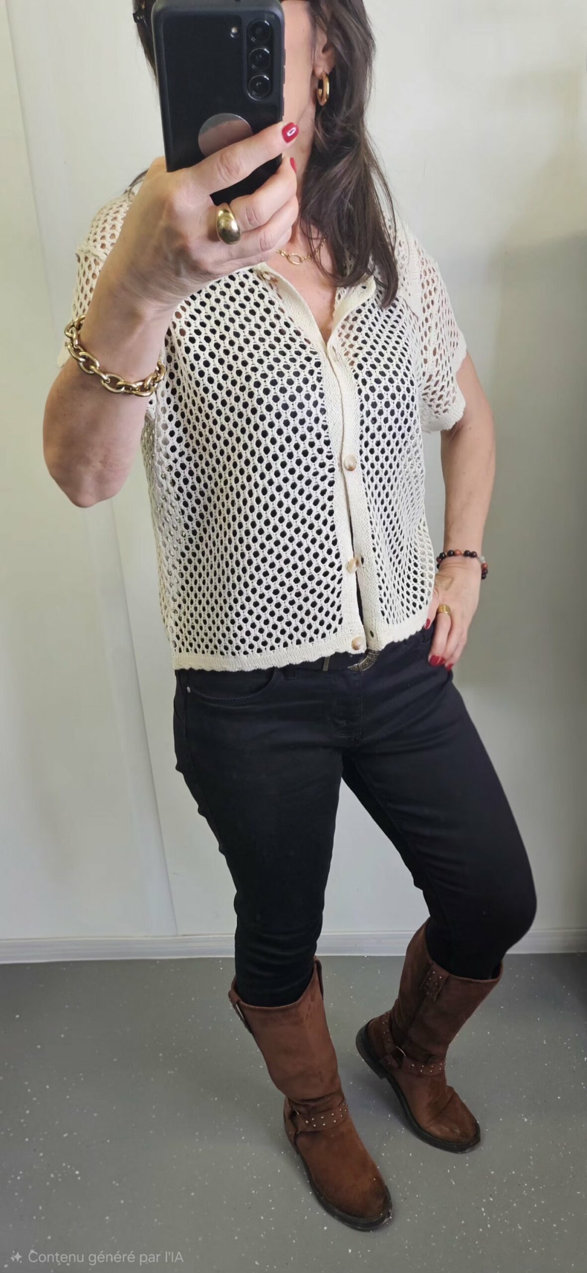 100% Viscose, maille ajourée, boutonnière et col façon chemise