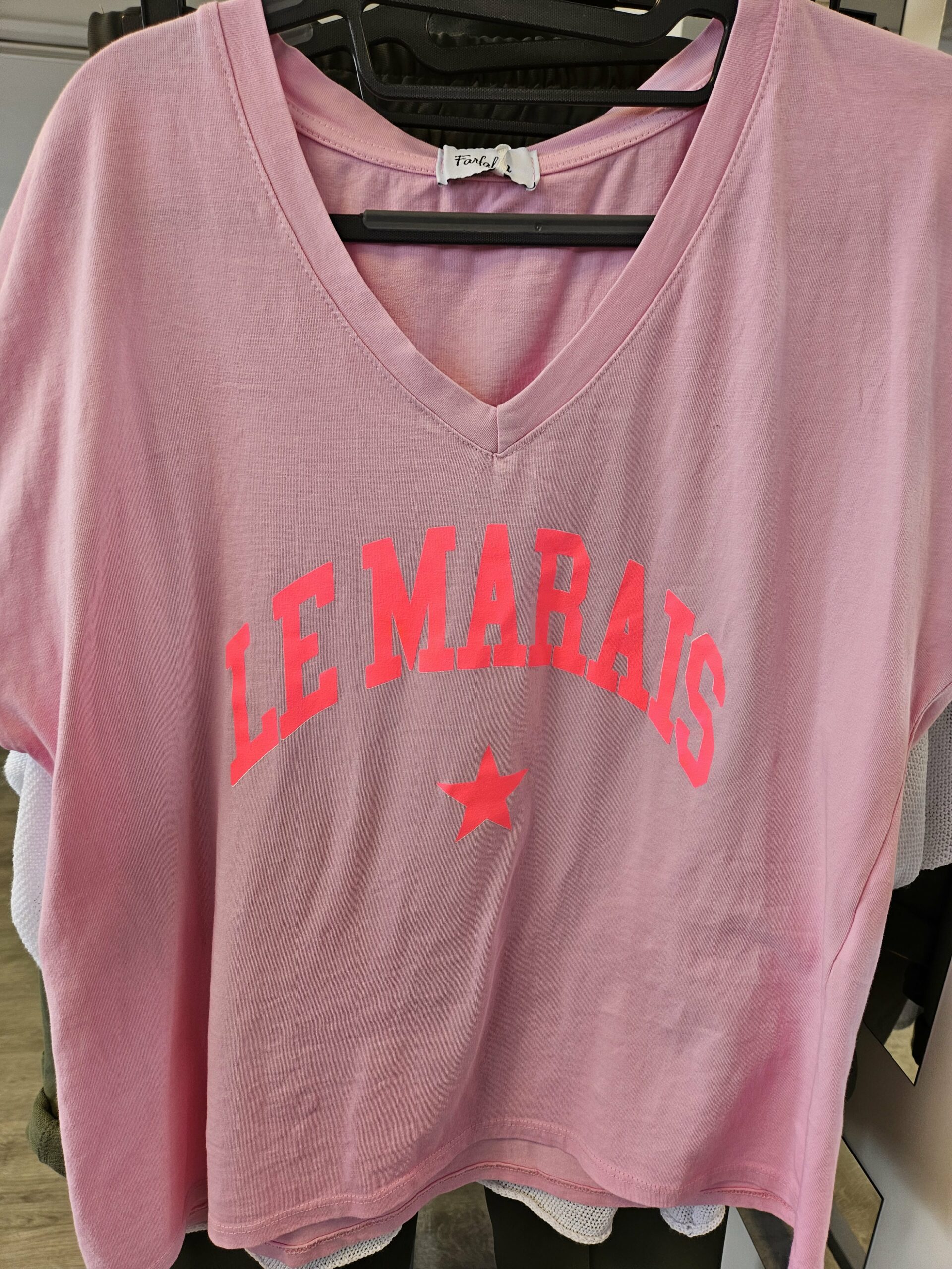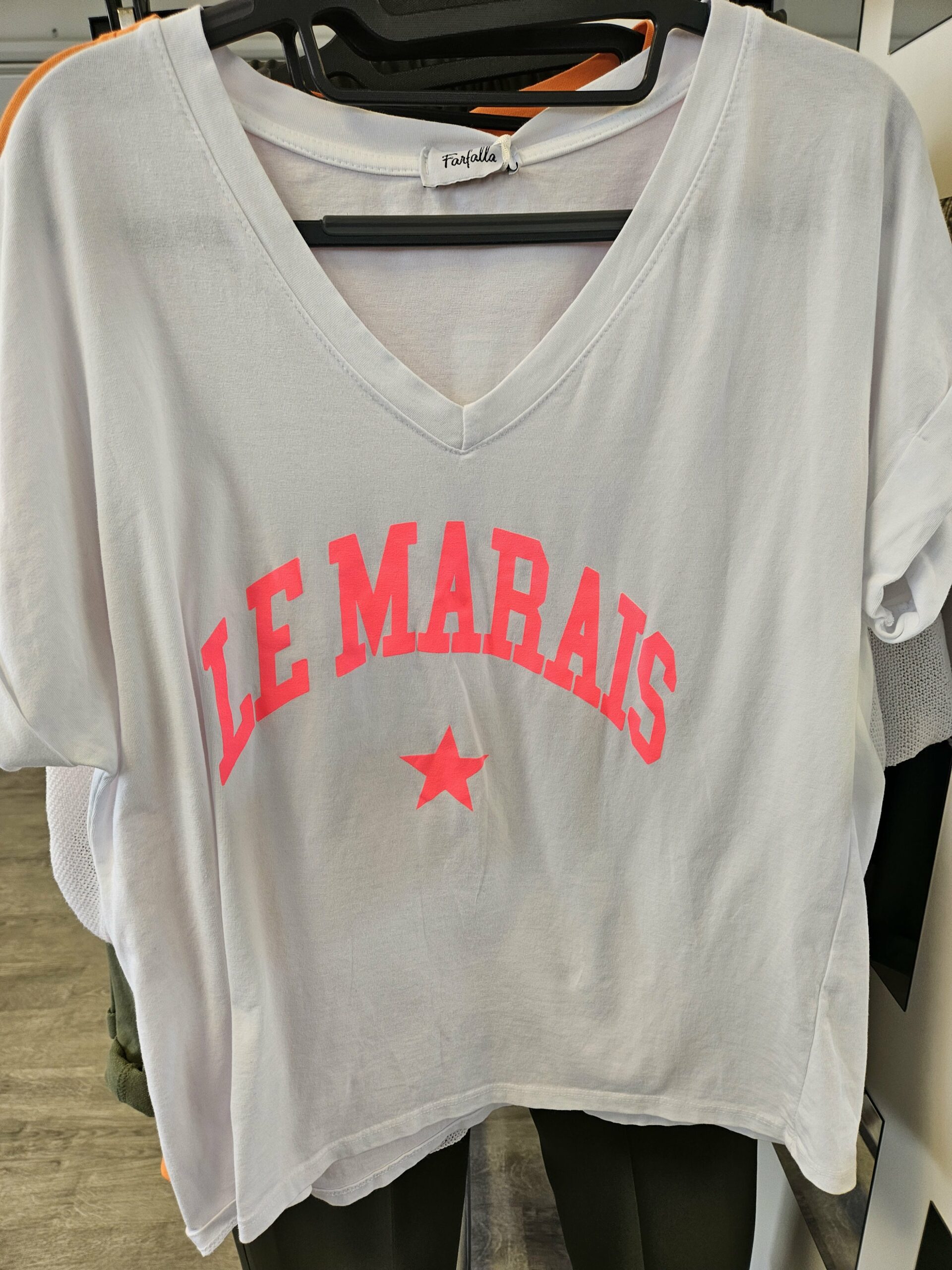 Inscription « Le Marais » thermocolle, manches courtes à revers, coupe kimono, col V